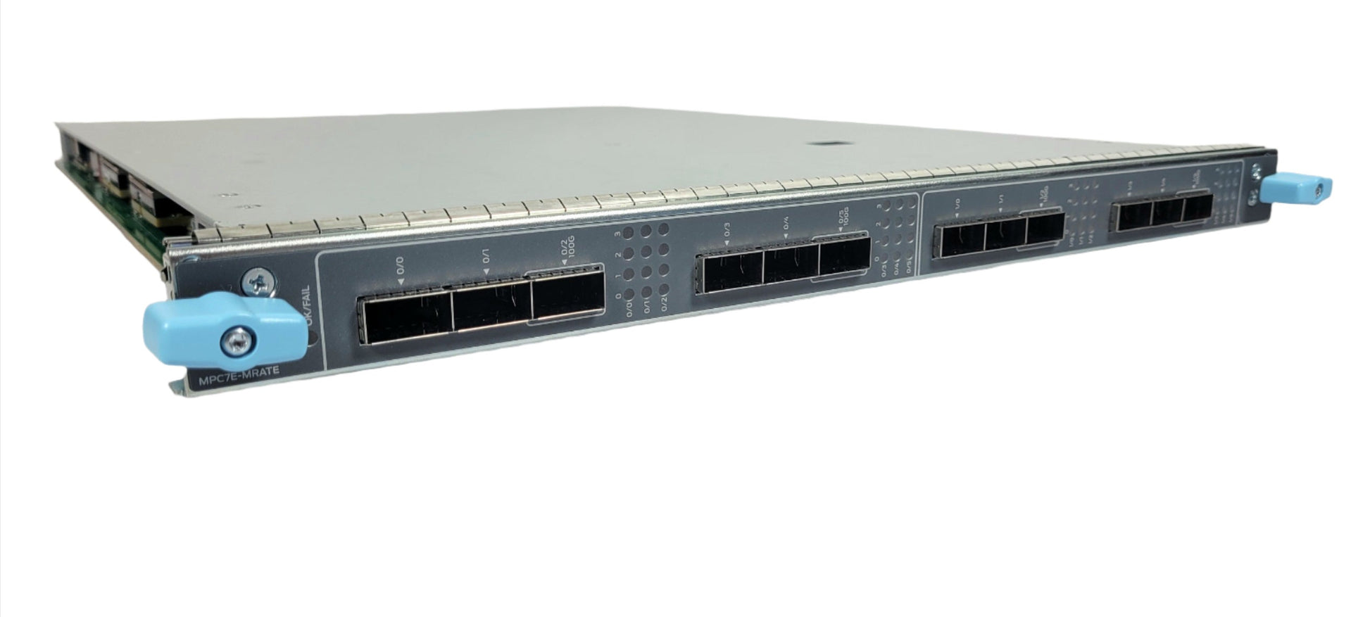 Juniper MPC7E-MRATE is a 12x QSFP+/QSFP28 multirate port line card. It includes full scale L2/L2.5 features, reduced scale L3, up to 2M routes in FIB, up to 6M routes in RIB, and up to 32 L3VPN instances per card.4 ports out of 12 support QSFP 28. Optics sold separately.